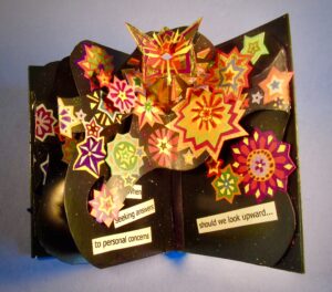 Star Gazer, 2022 – is a celestial journey through an endless universe to discover how to make sense of the future. Star Gazer transforms into the infinite expanse of the universe against an inky backdrop, a sweeping constellation of colorful hand-cut paper stars sweeps through the book page-to-page, diving through pages, around pages, splitting into divided channels, crisscrossing top and bottom, popping off the page surface, floating above the page, and finally converging in an explosion of celestial starburst and a final questions: in charting a life, are the answers upward or inward?